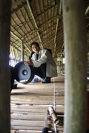Jainal Amambing wurde im Nordosten Borneos geboren, wo er auch heute noch mit seiner Familie lebt. Er gehört der indigenen Ethnie der Rungus an und wuchs in einer traditionellen Gemeinschaft auf – einer Lebensform die mehr und mehr verdrängt wird. In seinen Bildern zeigt er die kulturellen Traditionen und das alltägliche Leben der Menschen von Sabah. Die Werke des autodidaktischen Künstlers, der auch Reisbauer ist, waren bereits in zahlreichen Ausstellungen in Malaysia und auf der Singapore Biennale 2013 zu sehen. »Die Geschichte von Sansarinaga beruht einerseits auf einem Märchen der Rungus, einer indigenen Ethnie aus dem Bundesstaat Sabah im malaysischen Teil von Borneo. Andererseits habe ich mich beim Schreiben und Malen an meine eigene Kindheit erinnert. Damals spielten wir Kinder im Dorf gerne mit selbstgemachten Holzbüffeln. Natürlich kann ein solcher Büffel nicht bis zu den Wolken fliegen, aber weil ich meinen Holzbüffel so gern hatte, träumte ich oft davon, dass er fliege. Das hat mich zu diesem Bilderbuch inspiriert.« Jainal Amambing |  |